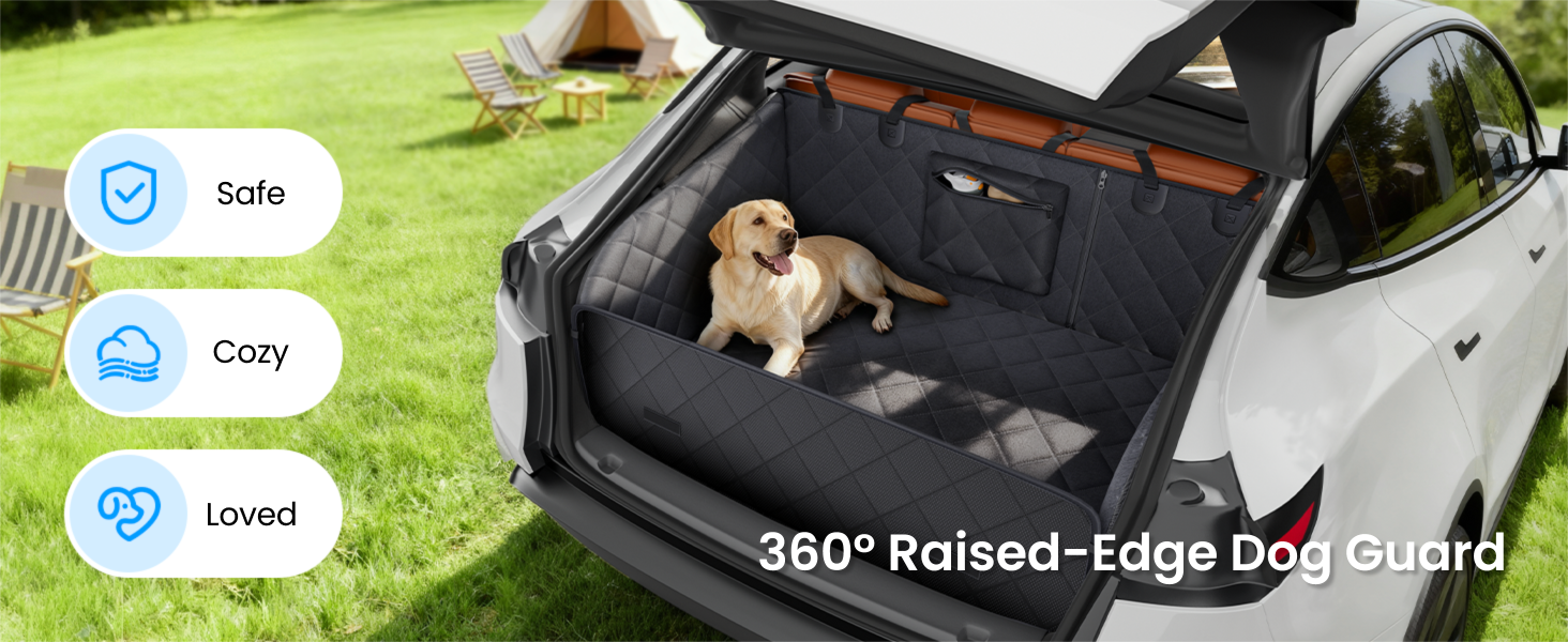 【Full Coverage for Total Protection】REEVAA SUV cargo liner gives your dog a safe space. The full-coverage design protects seats, sides, bumper, and tailgate — no unprotected spots. Soft padding keeps your dog safe and your car clean.