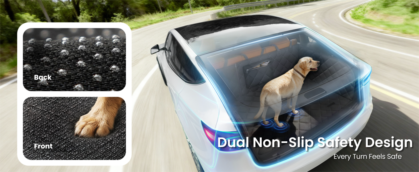 【Double Non-Slip for Steady Rides】Sudden stop or sharp turn? No problem. The textured anti-slip surface and rubber dots grip firmly. Lab-tested for +40% stronger grip — keeps your dog and gear steady on every bumpy road.